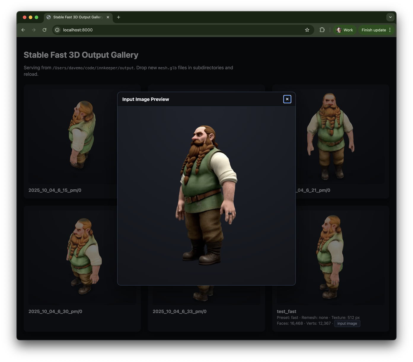 I had GPT-5 and Codex whip up a python script that generates a webpage using Google Model Viewer to preview the .glb meshes that Stable Fast 3D generates (along with basic texture and lighting info). This script lets me batch-create models at varying quality levels and compare them instantly in a browser.